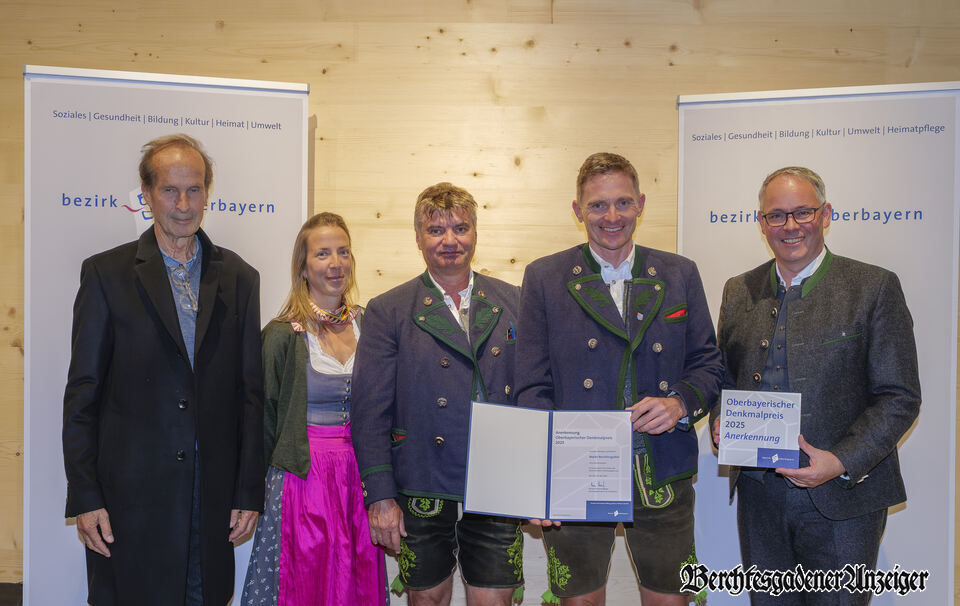 Bezirkstagspräsident Thomas Schwarzenberger (r.) übergab eine Anerkennung zum Oberbayerischen Denkmalpreis 2025 an den Markt Berchtesgaden, der den Rosenhofstadel vorbildlich saniert hat, es freuten sich (v.l.) die Architekten Rebecca und Peter Schorr, Marktbaumeister Peter Hasenknopf und Bürgermeister Franz Rasp. (Foto: Wolfgang Englmaier)