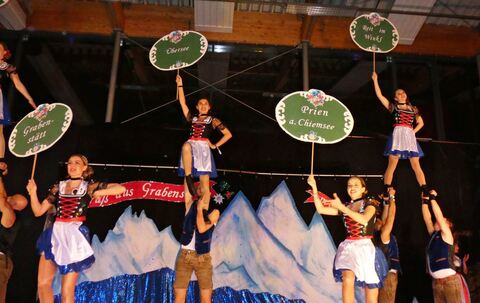 Rund 15 Garden und Showtanzgruppen aus den Landkreisen Traunstein, Rosenheim, Altötting und Berchtesgadener Land sorgten für ein rund fünfstündiges Feuerwerk aus Show, Tanz und Akrobatik. Die rund 1000 Besucher in der Turn- und Mehrzweckhalle Grabenstätt waren begeistert. Besonders großer Jubel brandete auf, als die heimische Faschingsgarde Grabenstätt ihr großartiges Showprogramm "Sommerfrische am Chiemsee" zeigte. Die Grabenstätter Kinder- und Jugendgarde wusste mit ihrer "Wild-West-Show" zu begeistern. Ausrichter war wieder der TSV Grabenstätt.