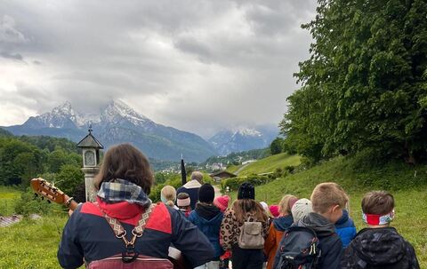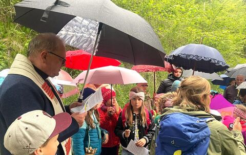 Zu Beginn erklärte Pfarrer Frauenlob den Kindern, warum Menschen sich zu einer Wallfahrt auf den Weg machen und was das für die Menschen bedeutet. Bei einer Wallfahrt gehen oder reisen Menschen zu einer Kirche oder einem Ort, der zum Beispiel Maria gewidmet ist. Weil sie an sie glauben und sie um Hilfe, Schutz oder den Segen bitten möchten. Nach dem Kreuzzeichen und einem gemeinsamen Gebet machten sich nun alle zusammen, ein Marienlied singend, auf den Weg zur Kirche Maria am Berg.