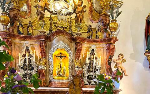 Im Anschluss feierten alle gemeinsam eine schöne Maiandacht, welche die Kinder mitgestalten durften. In der Maiandacht erfuhren die Kinder viel über die Taube als Friedenssymbol. Auch staunten sie über das Bild von Maria mit der Taube, das sie in der Kirche entdecken konnten. Der Kinderchor sang mit allen gemeinsam freudig verschiedene Marienlieder. Die Kinder durften die Marienfigur in die Mitte auf den Altar stellen. Pfarrer Frauenlob bot den Kinder an, Maria mit all ihren mitgebrachten Blumen zu schmücken, so entstand ein wunderschönes Altarbild mit »Maria in der Blumenwiese«.