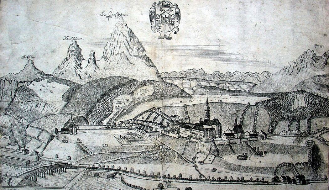 Bisher war nicht bekannt, dass ein Kupferstich von Georg Vischer von etwa 1660 als Vorlage für das Deckenbild diente. Ihn wird Christoph Lehrl von dem Geistlichen erhalten haben, der für das Programm verantwortlich war. Heute sind von diesem Stich nur mehr vier Exemplare bekannt, die sich im Museum Schloss Adelsheim, im Salzburg Museum, in der Stiftsbibliothek St. Peter in Salzburg und in einer Privatsammlung in Berchtesgaden befinden. Er ist bezeichnet: »Das Fürstliche Stüfft Berchtolsgaden« und enthält die Künstlersignatur: »G. Visher, delineavit et sculpsit«, das heißt, er hat das Blatt selbst gezeichnet und gestochen. Unter der Überschrift ist das Stiftswappen mit dem Herzschild des Wittelsbacher Administrators Maximilian Heinrich (1650 – 1688) zu sehen, der aus dem bayerischen Herrscherhaus stammte und als Kurfürst von Köln in Bonn residierte. So ist verständlich, dass Georg Vischer, der Wittelsbacher Hofmaler in München war, den Auftrag erhielt. Der Künstler hat das Stift vom Herzogberg gemalt, sodass der Priesterstein im Mittelpunkt vor dem Stift liegt und auch die alte gotische Pfarrkirche gut zu sehen ist. Sie wurde auf dem Deckenfresko durch den barocken Turm ersetzt. Dann zeichnete er die Schönfeldspitze, die er als Teufelshorn bezeichnete, den Watzmann mit der davorliegenden Alm Herrenroint und der seltsam wiedergegebenen Watzmann-Jungfrau und schob sie, wirklichkeitsfremd, von links in das Bild. Frater Christoph Lehrl malte nur den Ausschnitt vom Kleinen Watzmann bis zum Untersberg, anstelle des Wappens und der Überschrift erscheint bei ihm der hl. Augustinus. Auf die Abbildung des unteren Teils verzichtete er ganz.