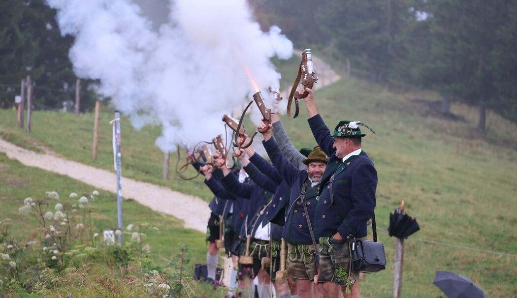 Berchtesgaden – Das Jahramt für alle verstorbenen und gefallenen Mitglieder des GTEV D'Weißenstoana Au findet traditionell am dritten Sonntag im August beim Roßfeldkreuz statt. Heuer regnete es zuvor in Strömen, doch für Pfarrer Bernhard Bielasik kam es nicht infrage, das Kreuz nicht einzuweihen. Er freute sich sehr, dass er eingeladen worden war, und antwortete: »So denkt ihr immer an mich.«
