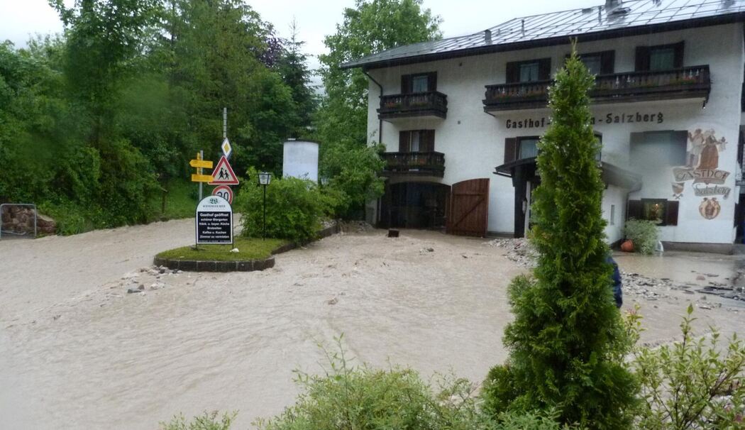 Land unter hieß es teilweise im Berchtesgadener Talkessel. Zwar waren die höher gelegenen Straßen und Häuser vom Hochwasser verschont. Gleichwohl nahmen die Gullys teilweise die enormen Wassermassen nicht mehr auf. Einige Keller liefen voll, auch in höher gelegenen Häusern.