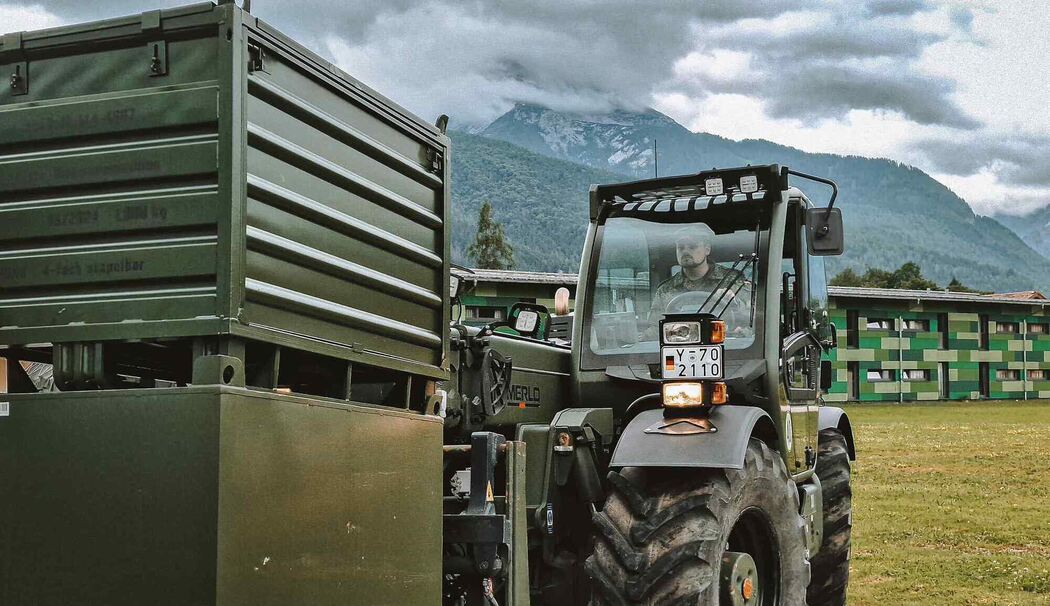Dem speziell ausgebildeten Fachpersonal steht der geländegängige Teleskoplader »Merlo« zur Verfügung. Seit 2022 ist das Fahrzeug für die Bundeswehr im Einsatz. Die Geländebereifung und der Allradantrieb machen ihn in nahezu jedem Terrain einsetzbar. Die vielfältigen Einstellmöglichkeiten der Achsen lassen es auch zu, auf engstem Raum zu arbeiten. Um die Ladung in Position zu bringen, kann der Teleskoparm auf bis zu sieben Meter ausgefahren werden. Im Falle eines Abrufs kann so das gesamte Lager schnell in jedes Einsatzgebiet transportiert werden.