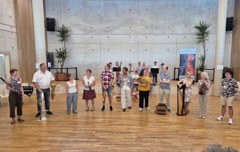 Mit einer Klarinettenmusi (Magdalena Becker, Katharina Aigner und Antonia Broihan) unter der Leitung von Marinus Zimmerer ging es volksmusikalisch weiter im Programm. Die abwechslungsreiche Programmgestaltung setzte sich mit einem Violinen-Blockflöten-Ensemble fort (Finja Eisel, Theresa Engelmann, Lisa Nydegger, Sandra Truckenbrodt, Mirjam Schmidt). Gespannt lauschte das Publikum dem darauffolgenden Harfentrio Eva Friederich, Finja Bode und Friederike Motz, die unter der Leitung ihrer Lehrkraft Ingeborg Weber alle Anwesenden mit feinfühligen Harfenklängen verzauberten.