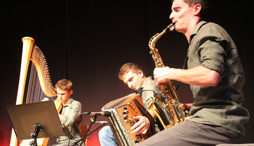 Zur »Wassertrog Musi« gehören außer Höllbacher an der Gitarre noch Tobias Gröll an der Posaune und Christof Angerer an der Ziach, alle drei in Tracht. Die Gruppe »Dreiklang« verkörpert die junge Generation, ist leger gekleidet und feiert im Februar auch schon ihr Zehnjähriges – mit Simon Metzendorf an der Ziach, Damian Ponn an der Harfe und Tobias Hartmann an der Gitarre und verwandten
