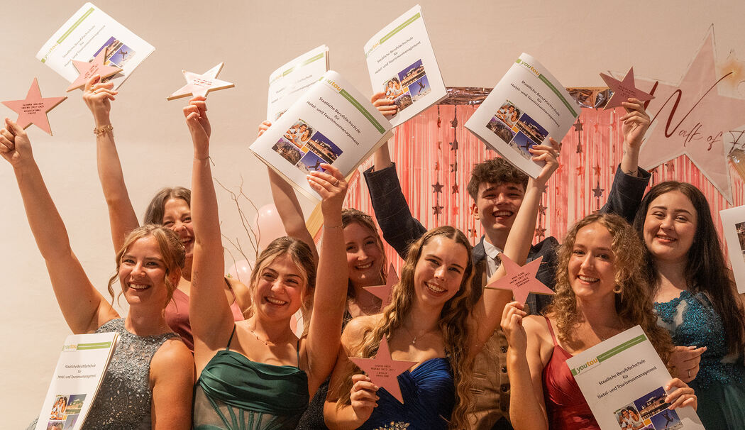 Organisiert wurde das festliche Event im Rahmen des Projektmanagement-Unterrichts der Klasse YOU 12. Der Abend begann mit einem stilvollen Sektempfang im liebevoll dekorierten Schulgarten, gefolgt von unterhaltsamen Showeinlagen. Die feierliche Zeugnisverleihung fand in der Aula statt – begleitet von einem umfangreichen Buffet, das keine Wünsche offenließ. Ein Highlight: Die Schülerinnen und Schüler durften ihre Zeugnisse nach dem Gang über einen roten Teppich entgegennehmen, geschmückt mit goldenen Sternen – ihrem ganz persönlichen »Walk of Fame«. Überreicht wurden die Auszeichnungen feierlich durch die Leitung der Berufsfachschule für Hotel- und Tourismusmanagement Karin Steinmüller. Ein Abend voller Anerkennung, Stolz und festlicher Stimmung, der den Absolventinnen und Absolventen sicher noch lange in Erinnerung bleiben wird. Ein gelungenes Fest, das zeigt: Diese jungen Menschen sind bereit für ihre ganz große Bühne. fb