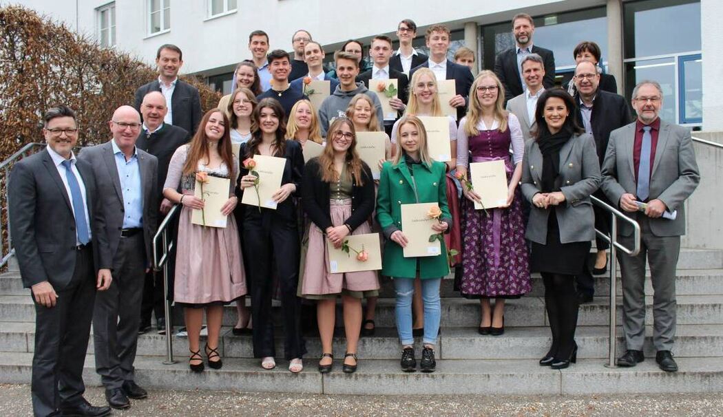Die erfolgreichsten Absolventinnen und Absolventen bat Martin Brunnhuber nun einzeln auf die Bühne. Zusammen mit seiner Stellvertreterin Sabine Ofner, den zwei Schülersprecherinnen und Landrat Bernhard Kern wurden sie unter viel Applaus für ihren Notenschnitt zwischen 1,0 und 1,5 mit Staatspreisen sowie Buch- und Sachpreisen und jeweils einer Rose ausgezeichnet.
