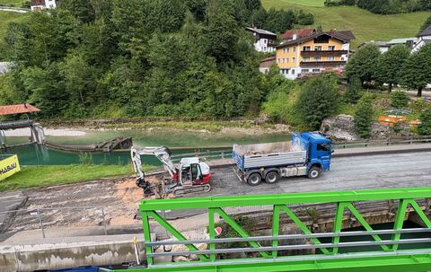 Nun aber wurde sie schon gestern Abend aufgehoben. Der Verkehr wird zunächst, bis nach dem Schellenberger Kirtag, wieder über die bestehende Bundesstraßenbrücke geführt, teilt das Staatliche Bauamt Traunstein mit. Am 9. Juli soll der Verkehr voraussichtlich auf die Behelfsbrücke verlegt werden, einspurig mit Ampelregelung. (Foto: Michael Ernst)
