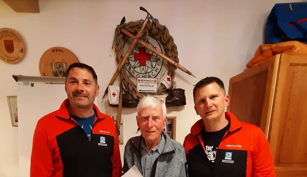 Ein besonderer Moment war die Ehrung von Andreas Angerer: Franz Wembacher und Stefan Obermaier überreichten im Namen der Bergwacht Bayern eine Auszeichnung für 65 Jahre Mitgliedschaft – eine seltene und herausragende Leistung im Dienst der Gemeinschaft.