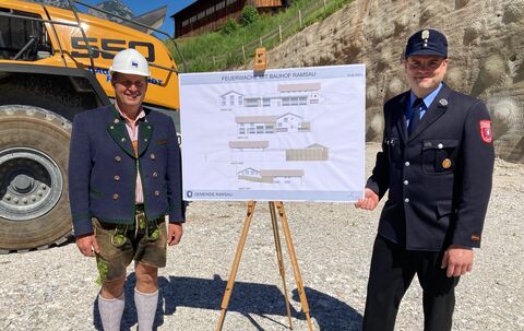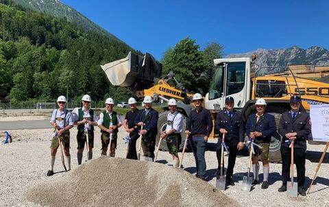 In das Gebäude, das in einer Winkelform errichtet wird, sollen nach Fertigstellung Ende 2022 der Bauhof und die Feuerwehr einziehen. Das Feuerwehrhaus erhält drei Garagen und eine Waschhalle, die auch von den Bauhofmitarbeitern genutzt werden kann. Im Obergeschoss werden unter anderem ein Schulungsraum und ein Aufenthaltsraum entstehen. Hinzu kommen Umkleideräume, Lager, ein Raum für den Kommandanten und ein Raum für die Jugendfeuerwehr. »Wir freuen uns, dass es nun endlich losgeht«, sagte der erste Kommandant Max Niedermayer. »Wichtig ist die dritte Garage.« Die Freiwillige Feuerwehr Ramsau hat im letzten Jahr ein weiteres Fahrzeug erhalten, das derzeit noch in einer separaten Garage beziehungsweise draußen geparkt werden muss. Niedermayer freut sich aber auch über die ebenerdigen Lagerräume, die eine erhebliche Arbeitserleichterung bedeuten würden.