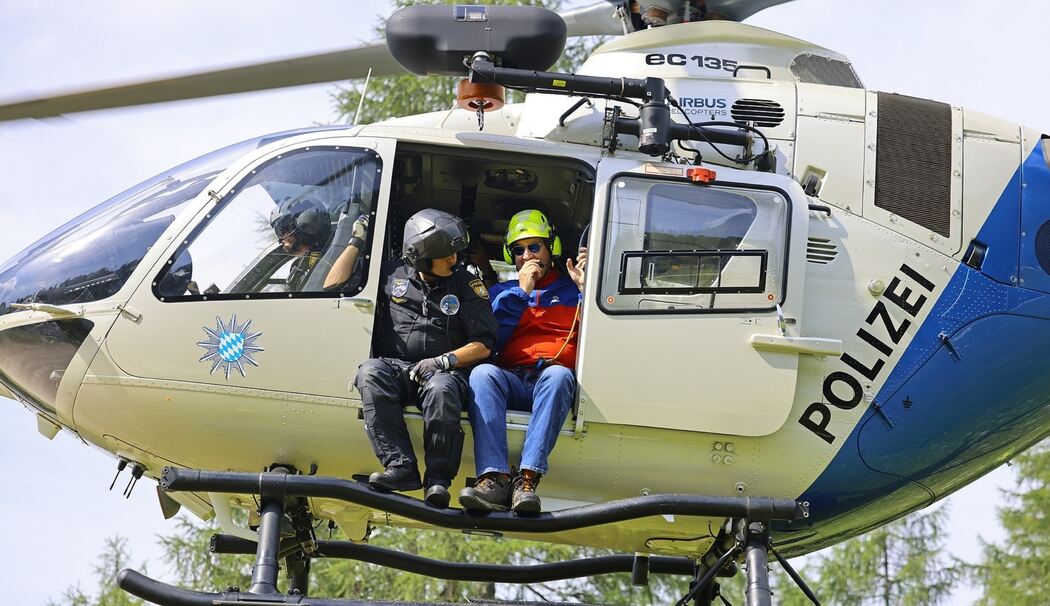 »Uns war besonders wichtig, dass beide Gäste so authentisch wie nur möglich miterleben, wie wir arbeiten und sich ein wirklich realitätsnahes Bild unserer Fähigkeiten machen können«, erklärte Burger. Angenommen wurde, dass ein Kletterer im Vorstieg ins Seil stürzt und zunächst für den Heli-kopter unerreichbar so nah an der steilen Wand hängt, dass ihn die Bergwacht erst weiter auf einen Felsvorsprung abseilen muss, damit ihn der Polizeihubschrauber mit der Winde aufnehmen und ausfliegen kann. Die Reichenhaller Bergretter Michael Ellinger, Florian Neubauer, Thomas Fischer, Matthias Wich, Josef Aschauer und Florian Weber hatten das spektakuläre Szenario aufwändig vorbereitet und dann zusammen mit der Besatzung der Polizeihubschrauberstaffel Bayern mit »Edelweiß 5« eindrucksvoll in Szene gesetzt.