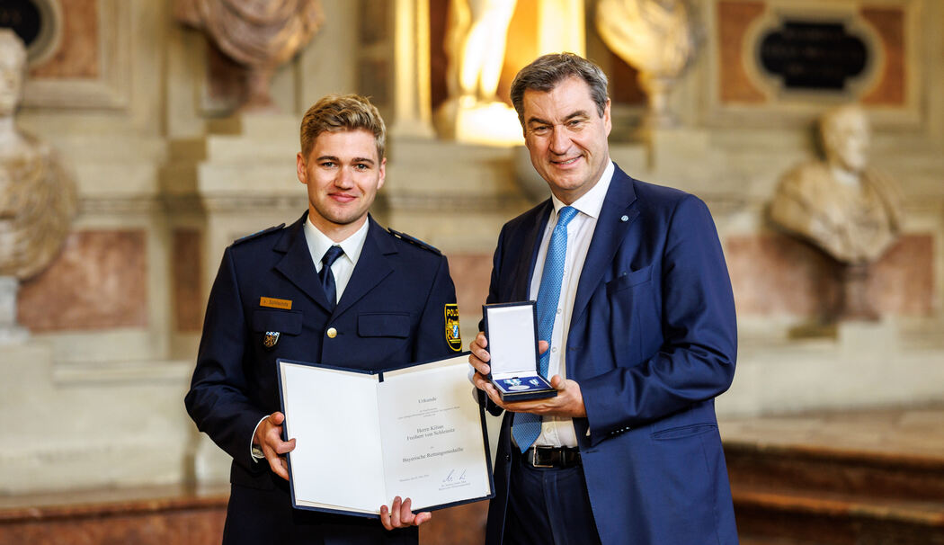 Schönau am Königssee – Er hat das Leben einer Frau gerettet, obwohl er sich dadurch selbst in Gefahr gebracht hatte: Der Polizist und ehemalige Skeletonpilot Kilian Freiherr von Schleinitz aus Schönau am Königssee zog im Februar 2023 eine Verletzte aus der Saalach. Trotz der starken Strömung konnte er sie damals sicher ans Ufer bringen. Für seinen beherzten Einsatz bekam der 29-Jährige jetzt die Bayerische Rettungsmedaille.