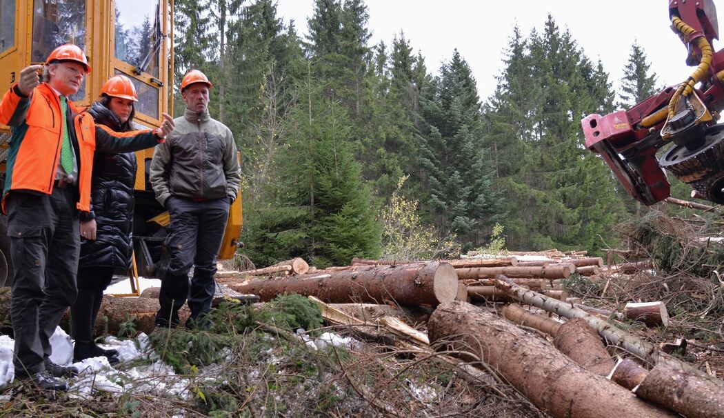 Aus diesem Grund entschied sich der Forstbetrieb auch, am Kohlhäusl in Anger einen Nasslagerplatz für bis zu 10 000 Festmeter Stammholz einzurichten. Das geerntete Holz wurde dort ständig mit Wasser aus dem nahe liegenden Bach benetzt. Wie der stellvertretende Leiter Armin Haberl später erläuterte, behält das Stammholz so den Wert wie frisch geschlagenes Holz und hat sogar viele Vorteile bei der weiteren Bearbeitung. Laut Dr. Müller wurden darüber hinaus noch zehn Trockenlager in den besagten Gebieten angelegt. Die Leistung der Mannschaft des Forstbetriebes Berchtesgaden sei auch deshalb so herausragend, weil trotz Steigerung des Arbeitsvolumens um etwa 80 Prozent die Belegschaft nur um 20 Prozent aufgestockt werden konnte. Umso mehr schätze er es, dass die Staatsministerin sich nun selber ein Bild machte und damit auch ihre Wertschätzung für diese Leistung ausdrückte.