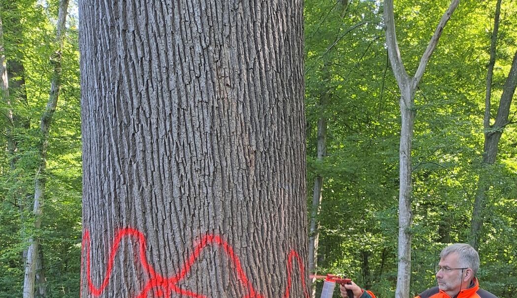 Um das versehentliche Fällen zu vermeiden, werden Biotopbäume und Methusaleme im Zuge der Hiebvorbereitung markiert. Mit dieser Maßnahme wird eine vorbildliche Waldbewirtschaftung auch gegenüber der Öffentlichkeit dokumentiert. Der vom Förster Thomas Klein »Coloredo-Eiche« genannte Methusalem hat nicht nur die für Biotopbäume typische Wellenlinie bekommen, sondern wurde auch noch künstlerisch mit einem Specht Symbol verziert. Mit den Worten »Die gesamten Bayerischen Staatsforsten wünschen der ›Coloredo-Eiche‹ ein möglichst langes Baumleben«, bedankt sich Müller bei dem vorbildlichen Förster Thomas Klein für den gewährten Schutz. fb