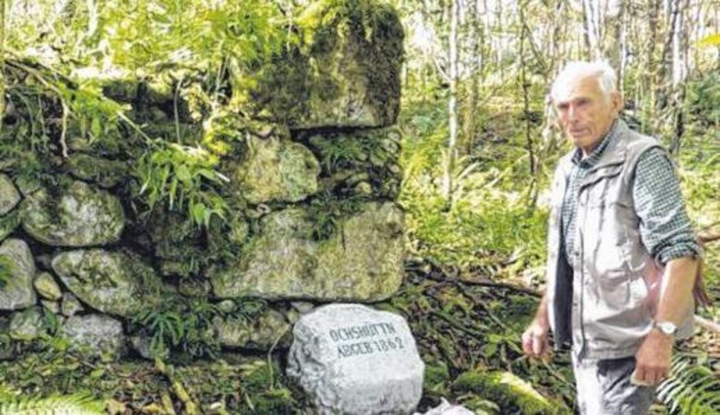 An den Gedenkstein in den noch gut sichtbaren Grundmauern der Ochshütte konnte sich Hias Renoth erinnern. Er hat ihn gesucht, gefunden, vom Moos befreit, gereinigt und die Inschrift fachgerecht restauriert. Einen Zugang von der Forststraße zu den noch vorhandenen Grundmauern hat er ebenfalls freigeschnitten.