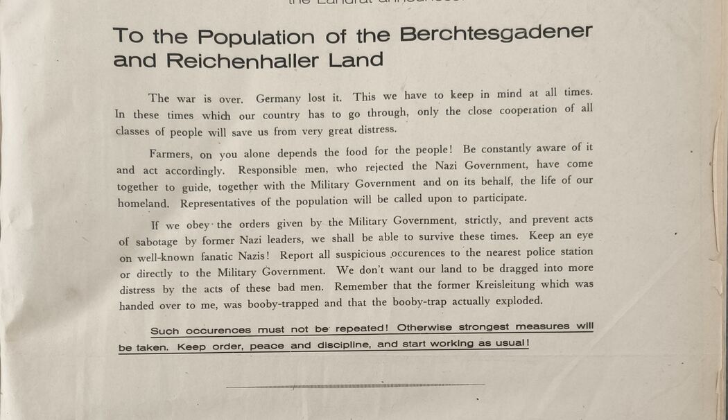 Mit der Übergabe Berchtesgadens an die US-Armee erscheint die Lokalzeitung nicht mehr. Nur 10 Tage später, am 14. Mai, wird die »Official Publication« des »Military Government« als »Amtsblatt« veröffentlicht, zweisprachig, mit Bekanntmachungen an die Bevölkerung. Der erste Satz lautete: »Der Krieg ist beendet.«