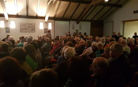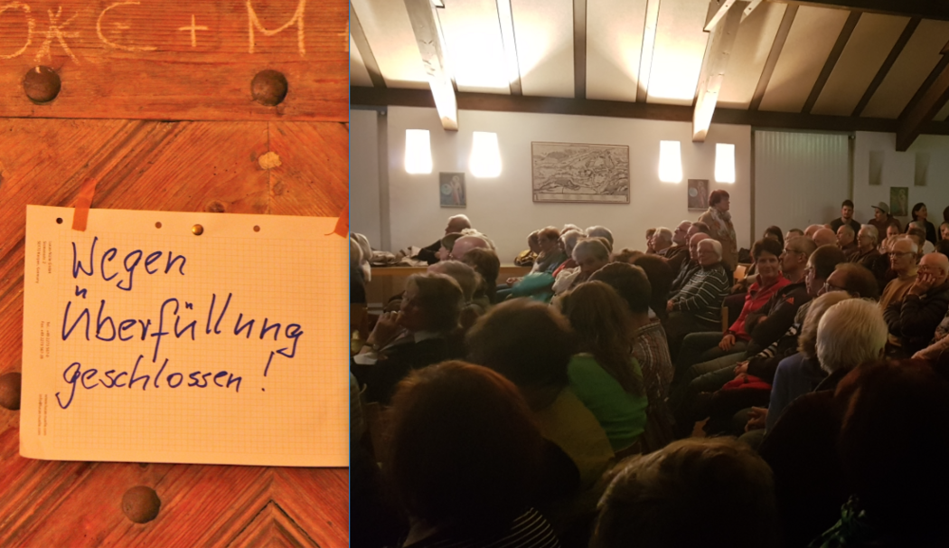 Bei Weitem nicht alle Interessierten fanden aber einen Platz, mussten am Ende sogar draußen bleiben, denn das Pfarrheim in Berchtesgaden platzte aus allen Nähten. Ein Blatt Papier an der Eingangstür verkündete die unerfreuliche Nachricht: »Wegen Überfüllung geschlossen.«