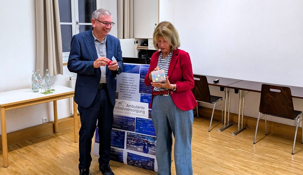 Begleitet von kräftigem Applaus und mit einem Blumengruß in den Händen wurde auch die langjährige Vorsitzende der ambulanten Ethikberatung, Dr. Birgit Krause-Michel, offiziell verabschiedet. Die Amtsübergabe an ihren Nachfolger Dr. Christoph Jung war bereits im Rahmen eines kleinen Festakts im »Klosterwirt Höglwörth« erfolgt. Stephan Bierschneider zeigte sich sehr glücklich, »dass es in der ambulanten Ethikberatung einen nahtlosen Übergang gegeben hat«. Birgit Krause-Michel betonte unterdessen, »meine Nachfolge ist mit Dr. Christoph Jung in besten Händen«.