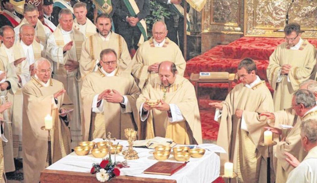 Der neu geweihte Auer Diakon Michael König trug das Evangelium von der Einkehr Jesu beim Zöllner Zachäus vor. In seiner ersten Predigt bat Frauenlob die Menschen um Mithilfe beim Aufbau einer aus dem Geist Gottes erneuerten, am Eckstein Christus ausgerichteten Kirche aus lebendigen Steinen. Nach der Weihe des Taufwassers durch Bischof und Frauenlob bekannte die Gemeinde ihren Glauben. Mit Frauenlob und Kaplan Stefan Leitenbacher zu seiner Rechten und Linken leitete der Bischof die Eucharistiefeier mit zahlreichen Konzelebranten.