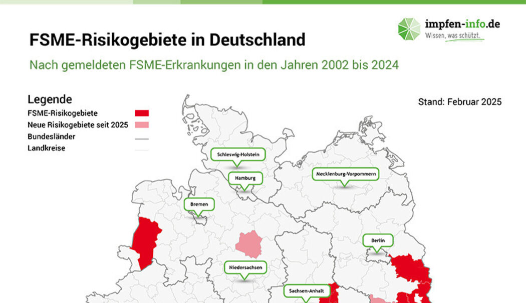 Jedes Jahr treten in Deutschland mehrere hundert FSME-Fälle auf. 2024 wurden dem Robert Koch-Institut (RKI) 686 FSME-Erkrankungen gemeldet – die zweithöchste Zahl seit Beginn der Erfassung im Jahr 2001. Bei der Erkrankung kann es zu Entzündungen des Gehirns, der Hirnhaut oder des Rückenmarks kommen. Menschen ab 40 Jahren haben ein höheres Risiko einer schweren FSME-Erkrankung. Eine medikamentöse Behandlung gegen das FSME-Virus gibt es nicht – nur die (vollständige) Impfung schützt wirksam. Weiterführende Informationen bietet der FSME-Erregersteckbrief unter www.infektionsschutz.de/erregersteckbriefe/fsme/.