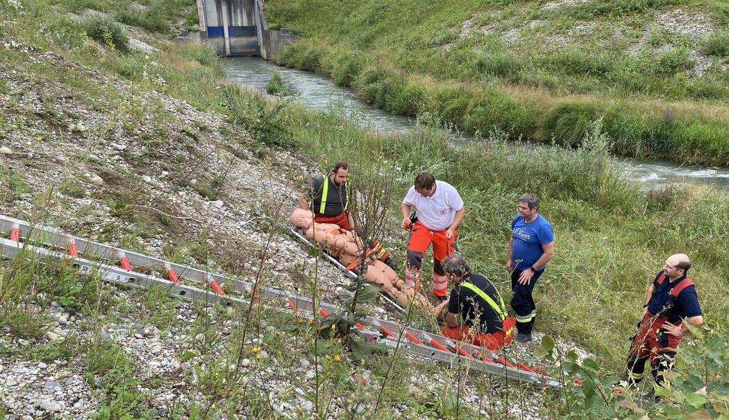 Anstatt des Hochwassereinsatzes wartete am Kraftwerksgelände eine Stationsausbildung mit fünf Ausbildungsschwerpunkten: An der ersten Station demonstrierte die Feuerwehr Laufen unter Beteiligung der Übungsteilnehmer die Leistungsfähigkeit der 2024 angeschafften Hochleistungspumpe, mit der bis zu 10 000 Liter Wasser pro Minute abgepumpt werden können. Zudem führte das THW eine leistungsstarke Tauchpumpe vor, die mittels Lkw-Ladekran eingesetzt werden kann.