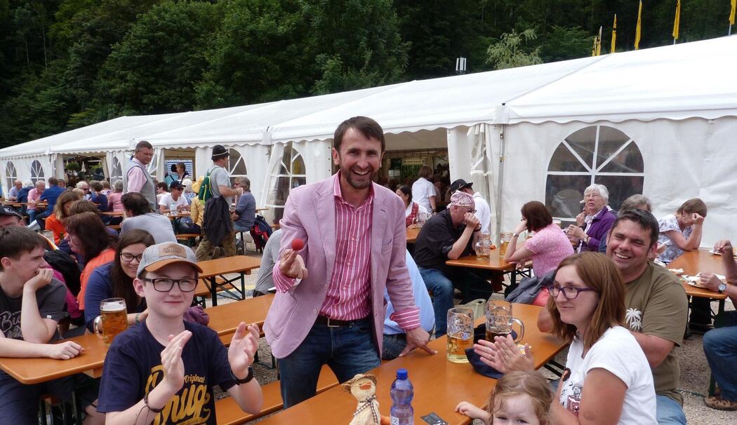 Die ersten Frühschoppenbesucher nahmen ihre Plätze bereits am Sonntagvormittag ein. Sie ließen sich vom Regen nicht vertreiben und vergnügten sich bei den Klängen des »Ratz-Fatz-Trios«. Magier Jakob Lipp brachte Groß und Klein mit seinen Zauberkunststücken zum Staunen.