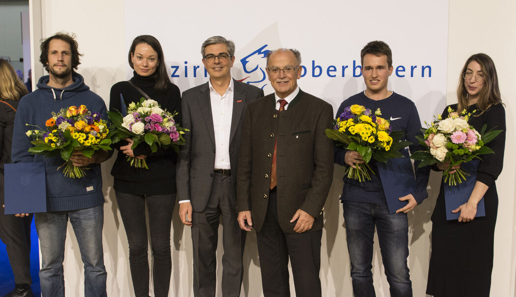 Der Oberbayerische Förderpreis für Angewandte Kunst 2017. Von Links: Markus Pollinger, Samira Götz, Dieter Dohr, (Geschäftsführer GHM), Bezirkstagspräsident Josef Mederer, Markus Brandner, Naama Bergmann