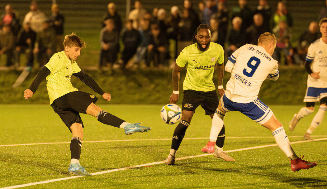 Die Stadionuhr zeigte noch die erste Spielminute, als Bischofswiesen nach einem Eckball durch Fabrice Enyange in Führung ging. Damit war das Konzept des Gegners bereits früh gestört. Doch die Gäste suchten daraufhin ihr Heil in der Offensive. Zunächst monierten sie ein Foulspiel, das der Schiedsrichter aber anders sah. Wenig später klärte die stabile FCB-Abwehr einen ersten erwähnenswerten Pettinger Angriff zur Ecke, die nichts einbrachte. Wie erwartet agierte Petting immer wieder mit hohen Bällen in die Spitze. Ein sehenswerter Angriff des FC Bischofswiesen führte bereits in der 14. Minute zum 2:0. Fabrice Enyange spielte auf Michael Hölzl, der wiederum Sean Groth ins Spiel brachte. Und der stramme Abschluss von Groth saß abgefälscht. 22 Minuten waren gespielt, als die Platzelf wieder einen sehenswerten Angriff über Michael Hölzl und Fabrice Enyange startete, den der Pettinger Torhüter klärte. In der 27. Minute zirkelte der beste Pettinger Spieler, Mannschaftskapitän Simon Jauk, einen Freistoß aufs Tor, den Schlussmann Christoph Irlinger per Faustabwehr über die Latte lenkte. Im Gegenzug erhöhte Bischofswiesen auf 3:0 (28.). Wieder waren es Enyange und Hölzl, die Ruben Weyer ins Spiel brachten, der schließlich vollendete. Die nächste große Chance, das Skore weiter zu erhöhen, vergab Reinhard Frick, der völlig frei zum Kopfball kam, aber im Stile eines Abwehrspielers den Ball aus der gefährlichen Zone köpfte. Wenig später kam Petting zu einer Kopfballchance, doch der Stürmer vergab etwas kläglich. Der Höhepunkt des ersten Durchgangs war das 4:0 in der 46. Minute. Michael Hölzl nahm mit dem Rücken zum Tor geschickt ein Zuspiel an und schloss mit einem sehenswerten Fallrückzieher ab. Daraufhin pfiff der Schiedsrichter die Begegnung ab.