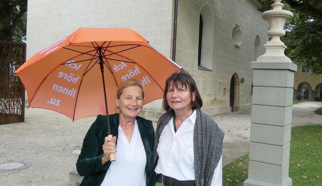 Die Seniorenseelsorgerinnen im Landkreis Traunstein Christina Fraunhofer (rechts) und Waltraud Jetz-Deser haben mit ihren Seniorenpastoral-Kollegen Barbara Burghartswieser und Andreas Nieder das neue Projekt »Offenes Ohr, offenes Herz – Begegnung und Gespräche am Friedhof« entwickelt. Zu erkennen sind die Seelsorger auf den Friedhöfen an den orangefarbenen Schirmen. (Foto: Müller)