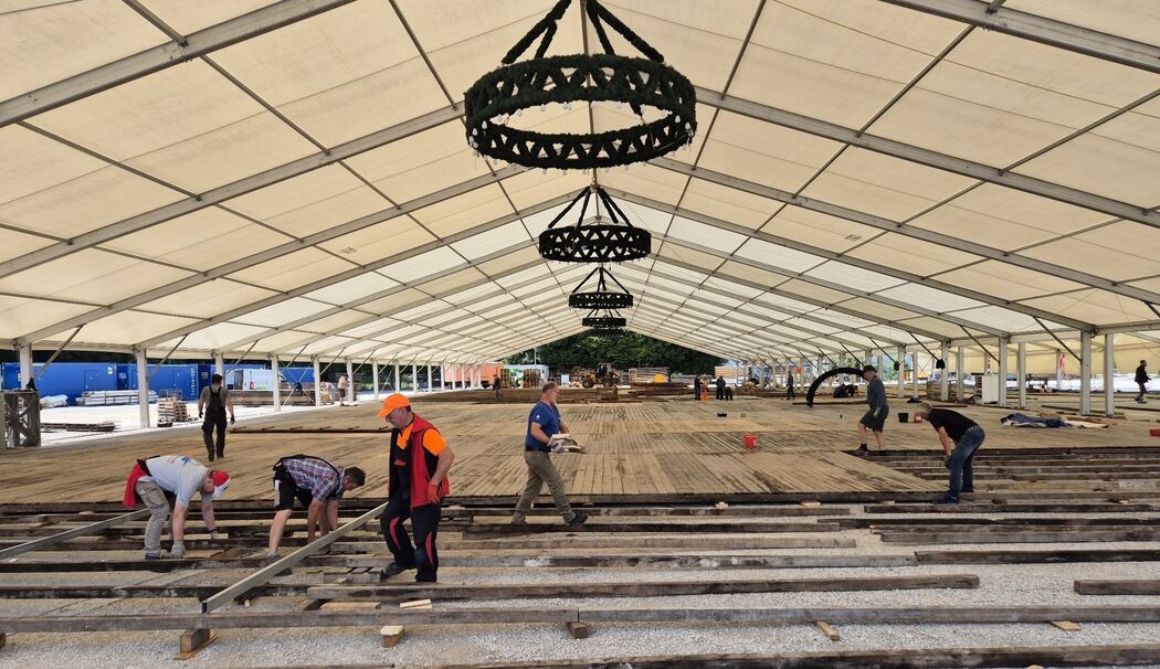Traunstein – Sie wächst und wächst: die Zeltstadt auf dem Festplatz an der Siegsdorfer Straße. Am Mittwoch haben die vielen Helfer der drei Trachtenvereine, die das Gaufest des Gauverbands I heuer in Traunstein ausrichten, angefangen. Wenn alles klappt, dann beenden sie die groben Arbeiten am Samstag, die äußere Hülle steht dann. Und in den folgenden Tagen geben sie der Zeltstadt dann noch den Feinschliff, mit Blumen und anderem mehr gestalten und verzieren sie dann das Innenleben – Auf Hochtouren läuft der Aufbau des Festzeltes samt Erweiterungen und Ergänzungen.