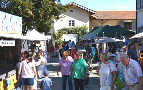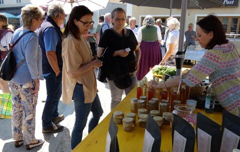 Zu kaufen gab es diverse Produkte aus der Region, darunter Fleisch, Wurst, geräucherte Forellen, Brotaufstriche, Biogemüse, Blumen, Gestricktes und Genähtes, Töpferwaren, Fotografien und Postkarten. Dazu gab es auch Wein, Kartoffeln und Obst aus der Pfalz. „Ich habe die Tage noch sechs Kilo Pflaumen-Marmelade eingekocht“, freute sich Verkäuferin Irmgard Strauch aus Übersee, die auch eigenen Honig im Angebot hatte. Angesichts des kalten und verregneten Mai schaue es heuer mit dem Blütenhonig ganz schlecht aus, dafür seien sie und ihre Mann, ein passionierter Imker, mit dem Waldhonig sehr zufrieden.