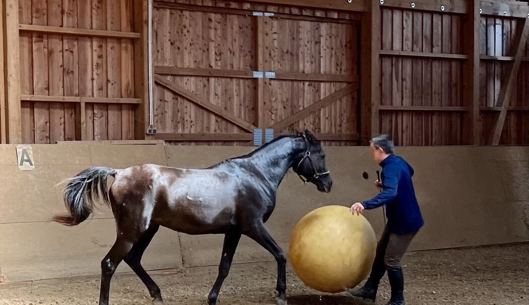 Der 11-jährige Vollblutaraber Malik scheint am Ballsport, den er mit einem riesigen gelben Gummiball betreibt, großen Spaß gefunden zu haben. Dieser Meinung sind Katja und Jens Dömland aus Nußdorf. Das ausgelassene Kicken in der Reithalle oder auf der Koppel bietet eine echte Abwechslung zur »Arbeit« unter dem Sattel. Viel freier noch als am langen Zügel durchs Gelände darf sich das Pferd ohne