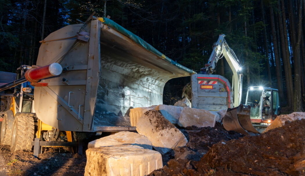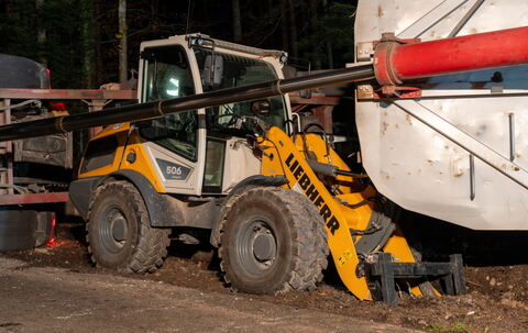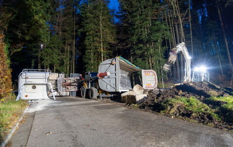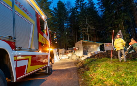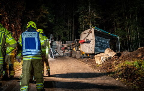 Nach ersten Informationen von der Einsatzstelle wollte der Fahrer an der Unfallstelle an der Wolfsbergstraße seine Ladung abkippen. Dabei stand das Gespann 90 Grad zur Fahrbahn. Durch den hohen Schwerpunkt des Lkw kippte dieser schließlich bergabwärts um. Zwischen dem Lkw und der aufgekippten Mulde befand sich ein Radlader, der kaum beschädigt wurde.