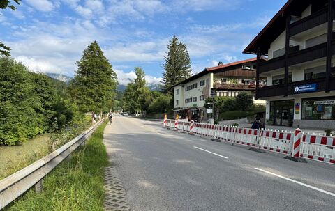 Auf der anderen Seite der Baustelle, also an der nördlich Ortseinfahrt, wo noch die alte Flussmauer steht, lässt das Wasserwirtschaftsamt aktuell hinter der Mauer rund 80 Zentimeter auf der Fahrbahnseite abgraben. Man prüft die Standsicherheit der alten Mauer. »Die Mauer ist hier noch in relativ gutem Zustand. Man wird sie vermutlich erhalten können«, sagt Gemeindebaumeisterin Regine Enenkel, als sie die Mauer betrachtet. Zur Stabilisierung wird lediglich hinter der Mauer Beton eingebracht.