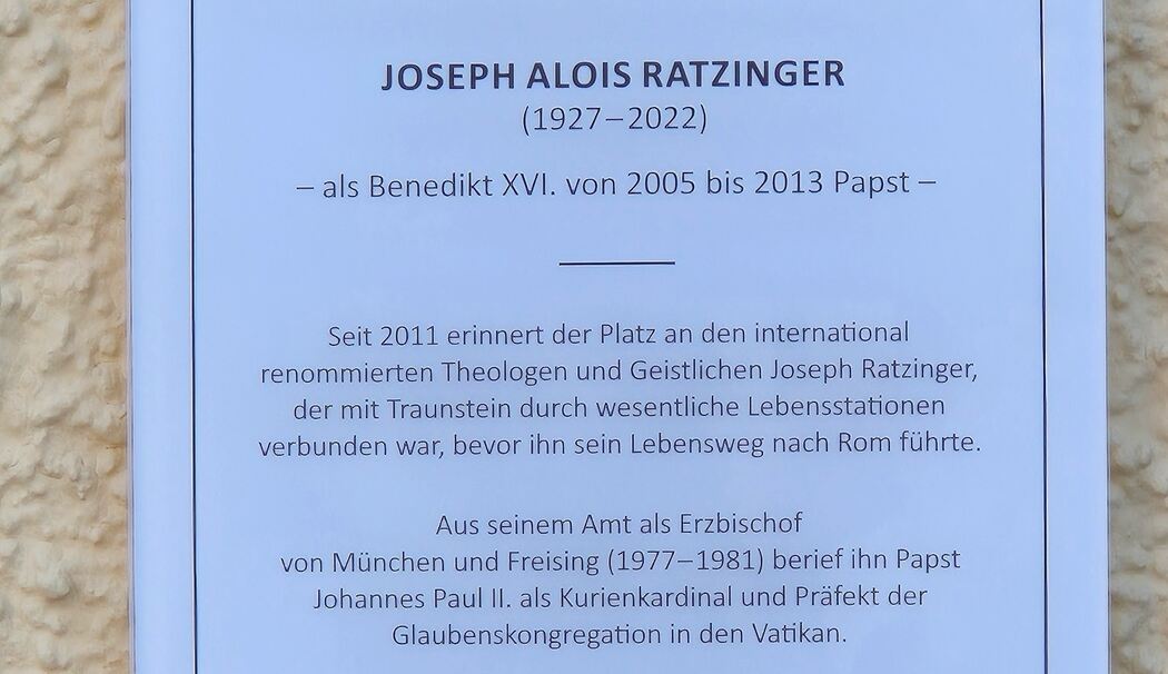 Traunstein – Die Verwaltung im Landratsamt hat die Beschilderung auf dem Papst-Benedikt-XVI.-Platz und am angrenzenden Denkmal für Turnvater Jahn abgeschlossen. In den vergangen Wochen hat sie zum einen zwei neue Kontextualisierungstafeln angebracht, die Informationen über Papst Benedikt XVI. und Turnvater Jahn enthalten. Und zuletzt haben die Mitarbeiter nun auch das alte Straßenschild »Papst-Benedikt-XVI.-Platz« aufgehängt, das sie vor der Sanierung des Platzes abgehängt hatten.