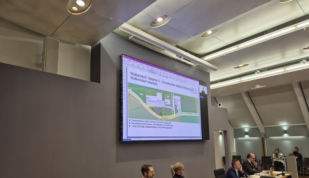 Erste Eindrücke, wo und wie die Stadt die Grundschule in Wolkersdorf bauen könnte, bekamen die Besucher der Stadtratssitzung: Auf der Leinwand war unter anderem auch die Variante zu sehen, das Gebäude am westlichen Rand des städtischen Grundstücks Richtung Wolkersdorf zu errichten. Nach dem Grundsatzbeschluss des Gremiums für Wolkersdorf – und gegen Haslach – beginnt nun die Planung. (Foto: Pültz)