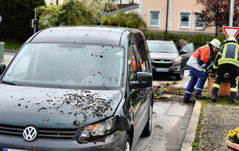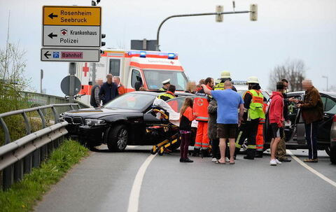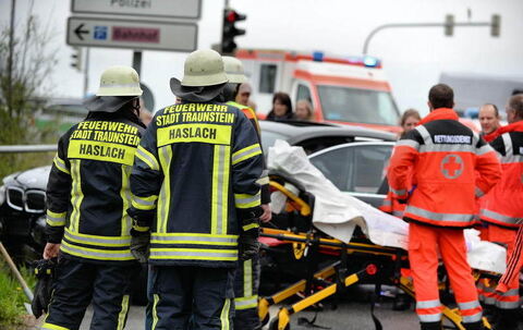 Am Sonntagvormittag, den 13.04.2014, ereignete sich ein Verkehrsunfall mit mehreren Fahrzeugen auf der Wegscheid Brücke gegen 11.30Uhr in Traunstein. Ein BMW Fahrer war auf der Chiemseestraße (St2095) in Richtung Wegscheid Brücke unterwegs und viel schon wegen eines auffälligen Fahrens auf. Als er dann versuchte links auf die Brücke zu fahren kam er auf die Verkehrsinsel, rammte dort einen der großen Blumentöpfe der auf die andere Fahrbahn sprang und dort das erste Fahrzeug erwischte. Nun versuchte der Fahrer auf die Rupertistraße zu fahren und kollidierte dort mit den noch stehenden links Abbiegern. Das erste Fahrzeug erwischte er frontal so stark das dieses durch die Wucht auf ein weiteres Fahrzeug aufgeschoben wurde und das dahinterliegende, einen Mercedes, auch noch erwischte. Als die Einsatzkräfte vor Ort waren weigerte sich der BMW Fahrer längere Zeit aus seinem Auto aus zu steigen. Es wurden eine beteiligte Frau und der Fahrer des BMW mit leichten Verletzungen in das Krankenhaus Traunstein gebracht. Die Feuerwehr Haslach regelte den Verkehr und die Polizei Traunstein nahm den Unfall auf.